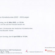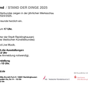 28. Preis des Vestischen Künstlerbundes, NRW weit ausgeschriebener Wettbewerb, Vernissage und Preisverleihung, 8. November 2025 um 18 Uhr, Kutscherhaus Recklinghausen, Finissage und Katalogvorstellung am Samstag, 7. Dezember 2025 von 15 - 17 Uhr